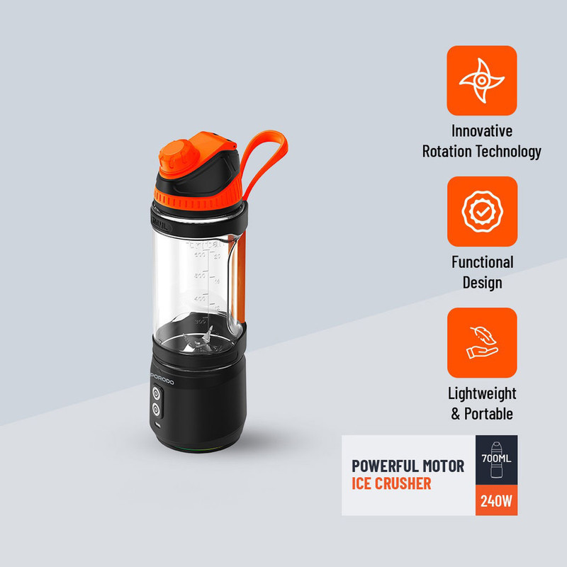 مخلوط کن قابل حمل پرودو مدل PD-PBLNDR، با امکان چرخش تیغه در دوجهت عقربه های ساعت و معکوس آن، یک وسیله بسیار کاربردی، چند منظوره و قدرتمند میباشد که مخصوص افرادی طراحی شده است که تحرک زیادی در طول روز دارند و همواره در حال حرکت هستند. مخلوط کن پرودو با داشتن تیغه استیل ضد زنگ 304 و به لطف برنامه چرخش نوآورانه خود، بدون زحمت و با انواع مواد غذایی از جمله یخ به خوبی کار میکند. این محصول با ظرفیت باتری قابل توجه 6000 میلی آمپر ساعت، با شارژ کامل که حدودا 3 ساعت زمان میبرد میتواند تا 40 فنجان آب میوه طبیعی را ترکیب کرده و در اختیار شما قرار دهد. در نتیجه میتوانید به سرعت کارهای آشپزخانه را انجام دهید و به موقع در کنار دوستان و میهمانان خود حاضر شوید. هر چرخه برنامه ترکیب، تنها در 30 ثانیه کامل میشود که توسط یک موتور فوق العاده قدرتمند 240 واتی هدایت میشود. طراحی کاربردی و هوشمندانه آن باعث شده تا هم سبک وزن باشد و هم قابل حمل، پس گزینه ای ایده آل برای آماده سازی انواع اسموتی ها، شیک ها و… در هر کجا که هستید میباشد.
