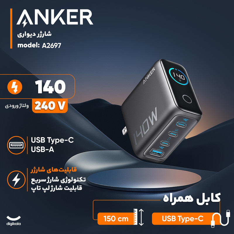 شارژر دیواری انکر مدل B2697 ظرفیت ۱۴۰ وات